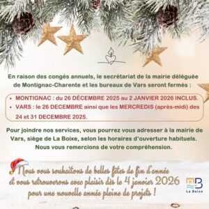 - Fermeture du secrétariat de la mairie annexe de Montignac-Charente et des bureaux de Vars fin décembre 2025 et début janvier 2026